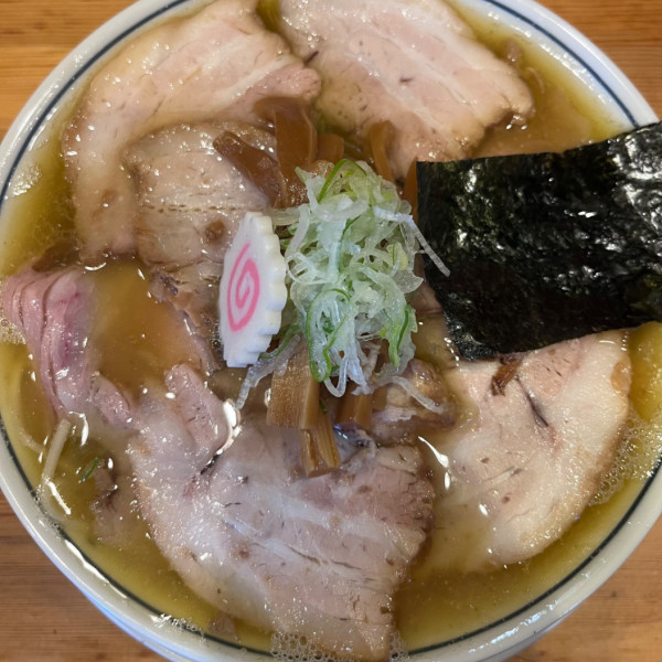 東京都杉並区天沼3-28-7マップで見るラーメンの鶏清湯ベースに昆布と帆立の素材が引き立つスープは驚く程旨味が強い。麺は函館出口製麺製の加水低目中細スト麺で麺肌艶々で麩と共にスープの旨味が染みていい。豚ロースチャーは炙りの香ばしいアクセントで旨し。