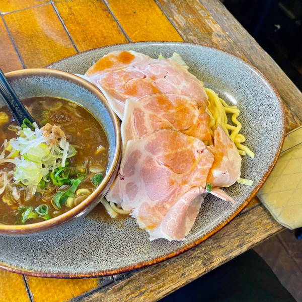 カレー店が提供する「カレーつけ麺」。お店自慢のカレーに和だしを合わせたつけ汁に、麺は極太麺を使用。
