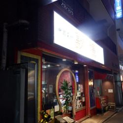 ・店の外観:赤色を基調とした中華風の外観、白色地に赤色文字の看板。