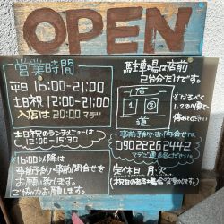 | 営業時間 | (平日) 16:00〜21:00 (土・日・祝) 12:00〜21:00(入店は20:00まで) |