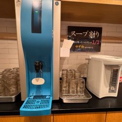 カウンター席のドセンに案内されると、お冷とスープ割りはセルフですとの案内がありました。