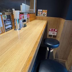 店内は黒基調でオシャレな、今日現在下に棚のある厨房向きLか字カウンター10席のみでお水は入って左側の冷水タンクにてセルフですが出して頂きました(壁側にハンガーラック、奥突き当たりにお手洗い)。