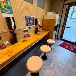 店内は木目調で落ち着いた、今日現在下に棚のある両壁向きカウンター8席.5席の計13席のみでお水は券売機左側の冷水機にてセルフ(奥左側にお手洗いあり)。