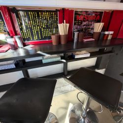 店内は赤.黒基調で狭小な、今日現在下に棚のある厨房向きL字カウンター4席と壁向きカウンター1席、4人掛けテーブル席が2卓ありお水は卓上のピッチャーにてセルフ(奥正面にお手洗いあり)。