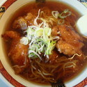 醤油ラーメンに唐揚げ、カレーコロッケ、白身魚フライが乗った一杯。